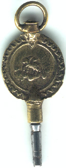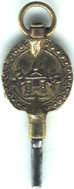 Clé plaquette gravée d'un temple entouré de chaque côté d'un