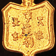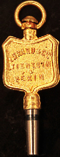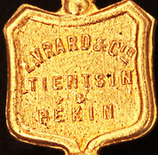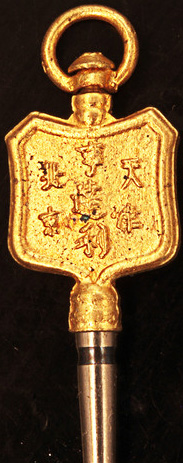 Clé publicitaire en laiton avec l'inscription "l.VRARD § Cie TIENTSIN - PEKIN" sur une face et des symboles chinois sur l'autre face.
