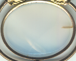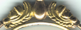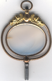 Clé en laiton doré muni d'une pierre ovale blanche. Tête de personnage se tournant le dos sculptée dans des glands et reposant sur un