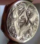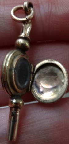 Clé en laiton munie d'un oval en argent dont une charnière permet de découvrir une cachette où déposer notamment un portrait ou une mèche de cheveu.