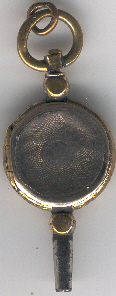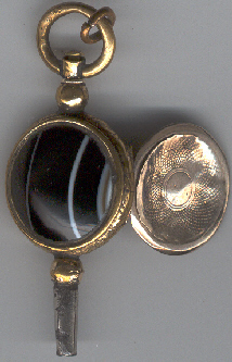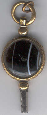 Clé en laiton doré avec une pierre noire rayée de blanc d'un côté et d'une cachette se fermant par une charnière