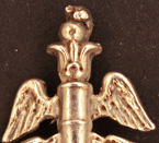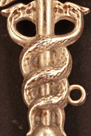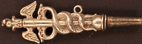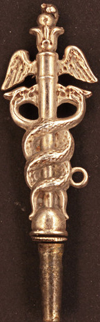 Clé en argent représentant un caducée de médecine : deux serpents entrelaçés surmontés par deux ailes d'oiseau.