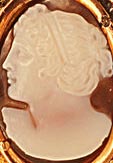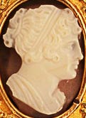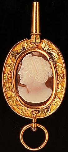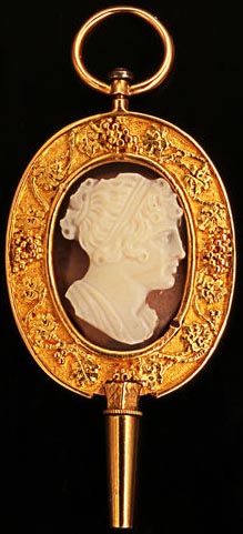 Clé ovale ouvragée en or munie d'un camé sur chacune de ses faces. Le pourtour des camés est entouré de dessins représentant des grappes de raisins, signe d'une clé du 1er empire.