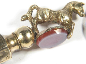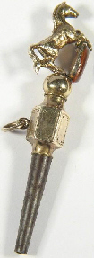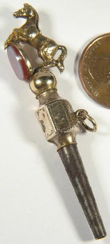 Clé en or surmontée d'un cheval chevauchant une pierre de deux couleurs (blanche entourée de rouge).