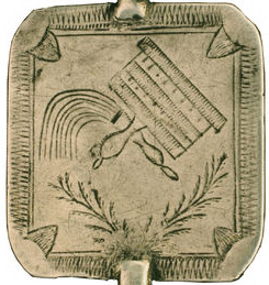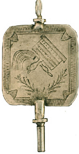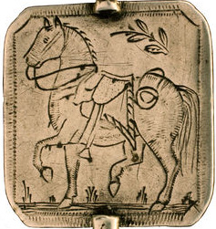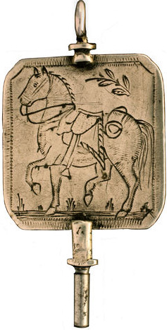 Clé en argent représentant un cheval en train de parader et sur l'autre face ses ustensiles.