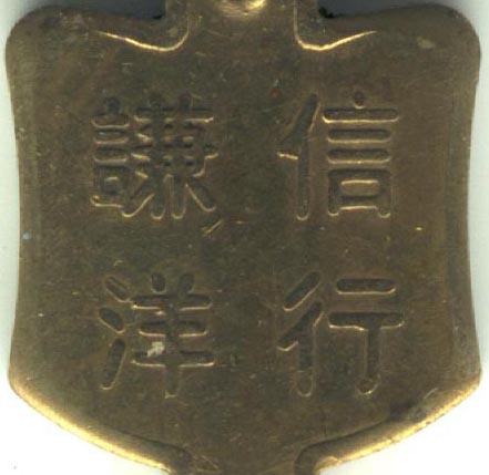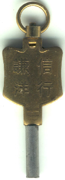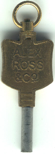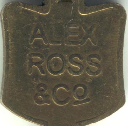 Clé publicitaire en laiton avec une inscription chinoise au recto et l'inscription "ALEX ROSS § Co" au verso.