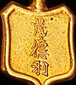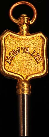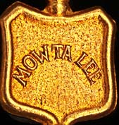 Clé publicitaire en laiton avec l'inscription "MOW TA LEE" sur une face et un texte en chinois sur l'autre face.