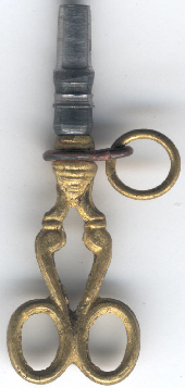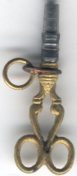 Clé en laiton en forme de ciseau. 3.6 cm de longueur et 1.3 cm de largeur.