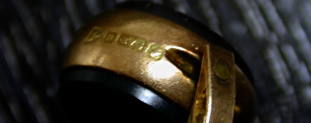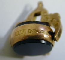 Clef en or en forme de cloche munie de deux pierres noires. Poinçons visibles.