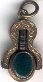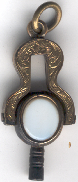 Petite clé en or en forme de cloche dont le clé se plie pour rentrer dans la cloche, munie d'une pierre blanche et d'une pierre verte tachetée de rouge.