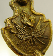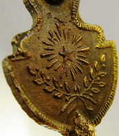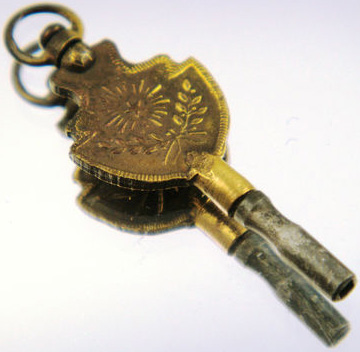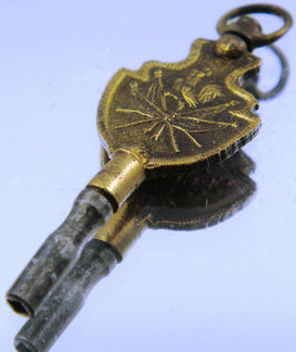 Clé en laiton décorée d'un coq et d'un drapeau d'un côté et de deux lauriers surmontés d'une étoile entourée d'un soleil de l'autre côté.