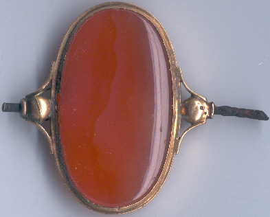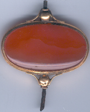 Grande clé en or munie d'une pierre cornaline ovale. L'anneau d'accrochage manque et le carré est fortement usé et donc inutilisable.