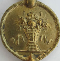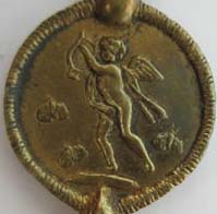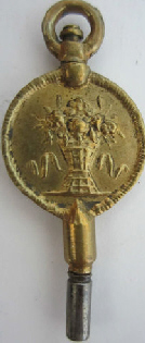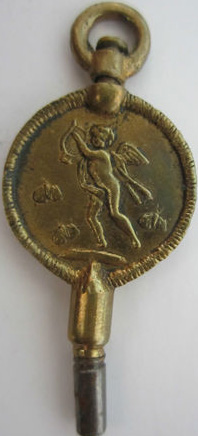 Clé représentant cupidon sur une face et un bouquet de fleurs sur l'autre face.