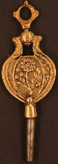 Clé plaquette gravée représentant cupidon sur une face et une fleur sur l'autre face.