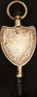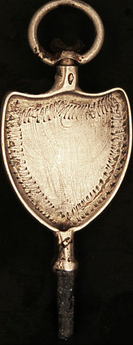 Clé plaquette gravée en argent en forme d'un écusson.