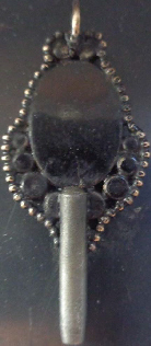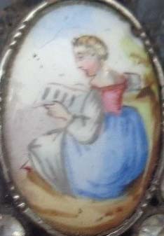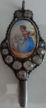Clé émaillée représentant un personnage féminin tenant un papier en main, soit en train de lire. bourgeois.