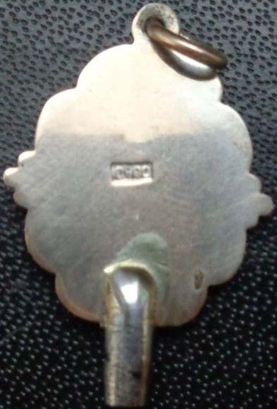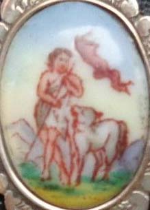 Clé émaillée représentant un berger en montagne accompagné d'un animal.