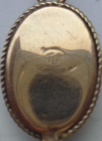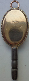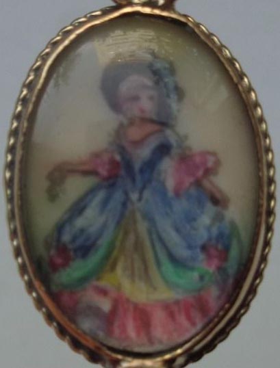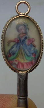 Clé de forme ovale émaillée représentant une femme dans une robe colorisée.