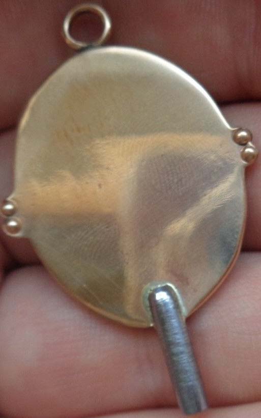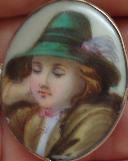 Clé de forme ovale émaillée représentant le portrait d'une enfant à cheveux long portant un chapeau vert.