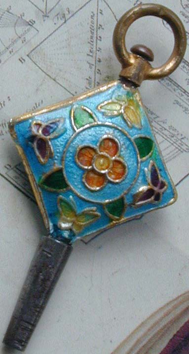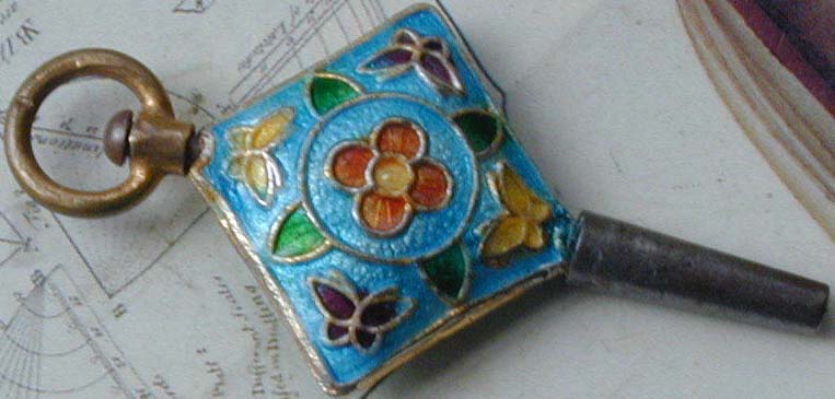 Clé émaillée de forme rectangulaire de couleur bleue représentant des décors floraux de diverses couleurs.