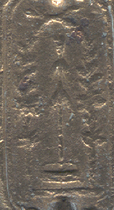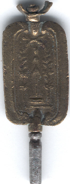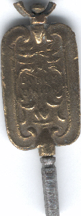 Clé plaquette gravée en laiton représentant le mariage. Sur une face, une arche de fleur et sur l'autre face, l'inscrition douce union surmontée de deux oiseaux.
