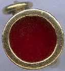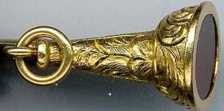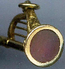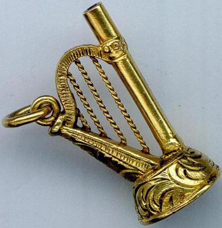 Clé en or en forme de harpe portant à son embout une pierre rouge ronde.