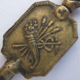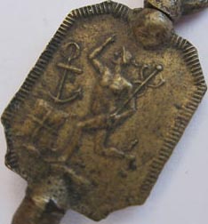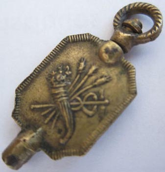 Clé plaquette gravée en laiton. Sur une face, le personnage hercule, une ancre et sur l'autre face, une corne d'abondance.