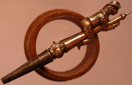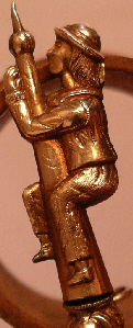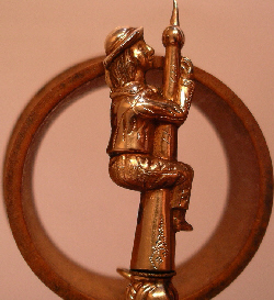 Clé munie d'un décor d'une tour dont un homme est enlacé autour ou semblant volé.