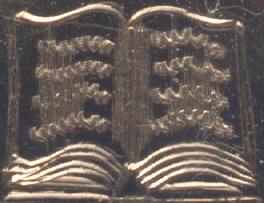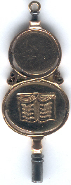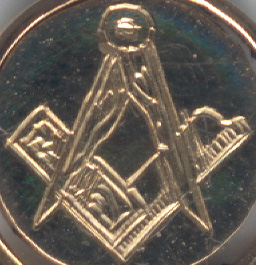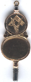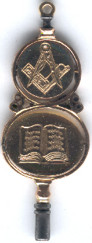 Clé en or maconnique reprenant le corps de métier d'instituteur des écoles en ce qui concerne le compas et l'équerre (mathématique) (dans un rond qui tourne sur lui-même) et le livre (français) (dans un oval qui tourne également sur lui-même).