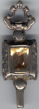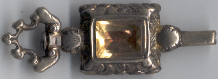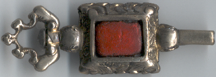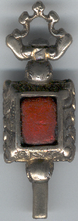 Clé en argent macif muni d'un côté d'une pierre translucide jaune et de l'autre côté, une pierre rouge (qui semble avoir été rajoutée suite surement à la perte de la pierre d'origine.