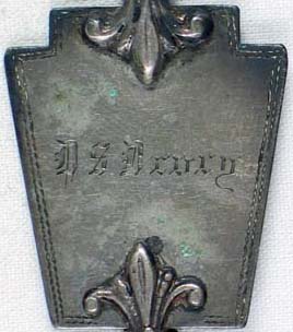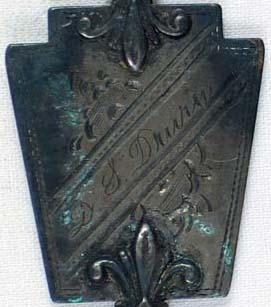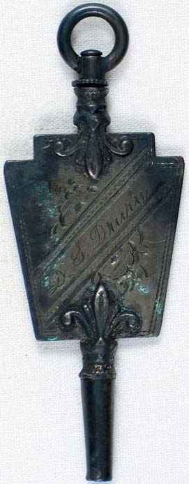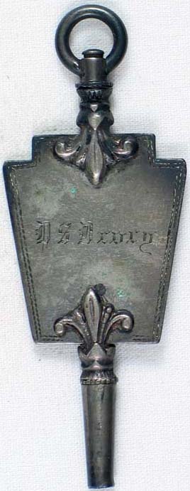 Clé plaquette gravée en argent dont le carré et l'anneau sont "maintenus" par une fleur de lys.
