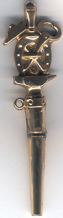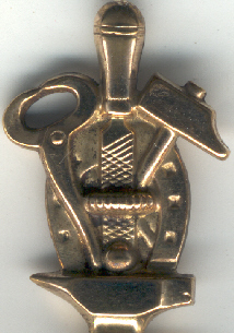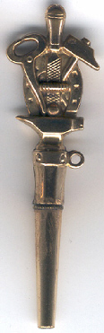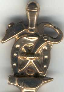 Clé en or maçonnique reprenant le métier de maréchal-ferrand : les outils sont le marteau, le fer à cheval, la lime, la tenaille, le tout sur une enclume.