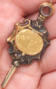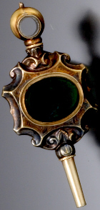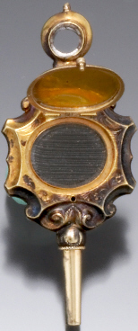 Clef munie d'un cache avec une charnière qui permet de découvrir une cachette muni d'une pierre de couleur sombre. Cette cache est décorée d'un décor d'un mémorial. Au verso, une pierre de couleur sombre