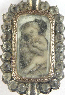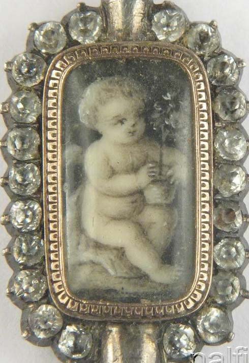 Clé de forme rectangulaire émaillée représentant un enfant accompagné de son fob.
