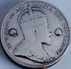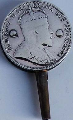 Clé représentant une pièce d'origine anglaise représentant la famille royale. Sur une face, La reine Victoria et sur l'autre face, le roi Edward VII.
