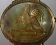 Clé micromosaïque en nacre représentant un coq au dessus d'une trompette.