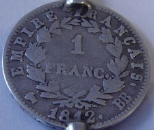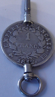 Clef représentant une pièce de 1 franc entourée de lauriers et surmontée de l'inscription "Empire Français 1812 BB"