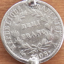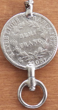 Clef représentant une pièce d'un demi franc entouré de lauriers surmontée de l'inscription "République Française" et "1808" sur une face.