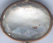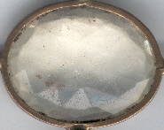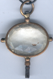 Clé en laiton munie d'une pierre ovale blanche qui a été taillée. la clé est munie d'une petite chaîne en acier d'une longueur de ?? centimètres.