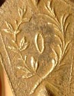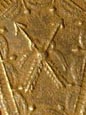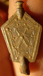 Clé plaquette gravée en laiton. Sur une face, une branche de laurier et une branche de palme. Sur l'autre face, deux flèches entrecoisées.
