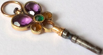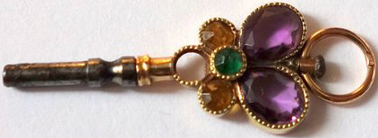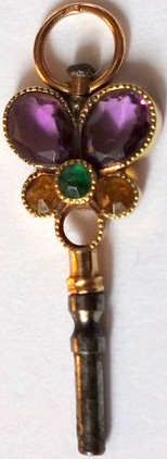 Clé en or représentant un papillon avec quatre pierres en améthystes, citrine et pierre verte (emeraude, uvite ou autre).