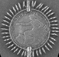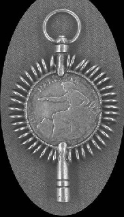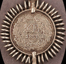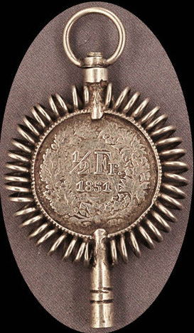 Clé représentant une pièce d'origine helvétique Sur une face, la valeur 1/2 Franc année 1851 et sur l'autre face, un personnage représentant une femme.