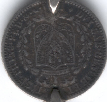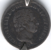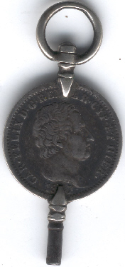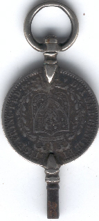 Clé représentant une pièce. Sur une face le portrait d'un personnage, une date "1827" et un texte "car.felix d.g.rex?ar-cyp.et.hier". Sur l'autre face,un emblème et une inscription "tisf.princ.ped.§.?.?.dvx sab.genvae et". A vérifier qu'il s'agit d'une pièce de la sardine.