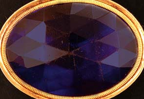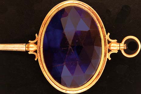 Clé en laiton munie d'une pierre ovale d'une couleur bleutée.