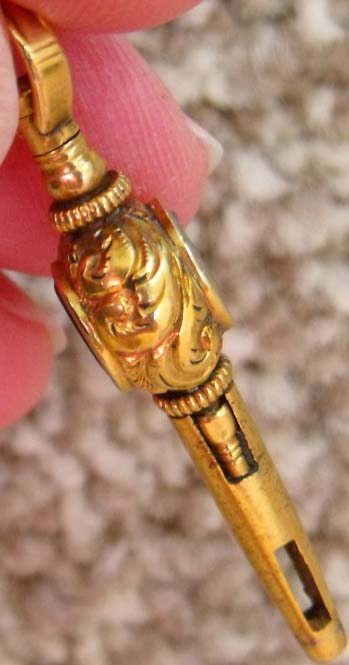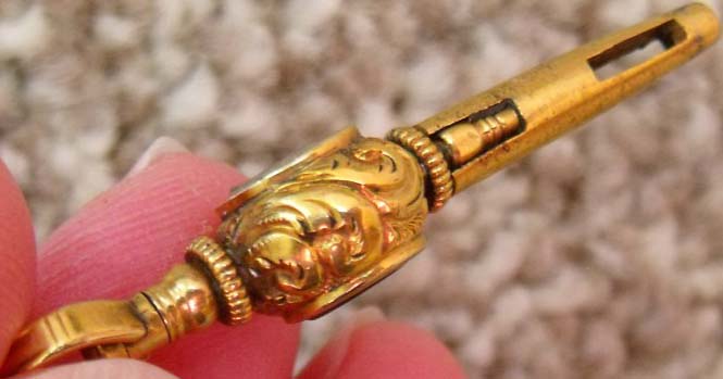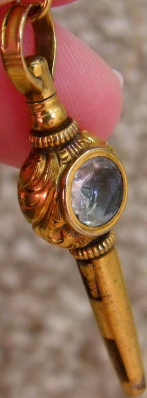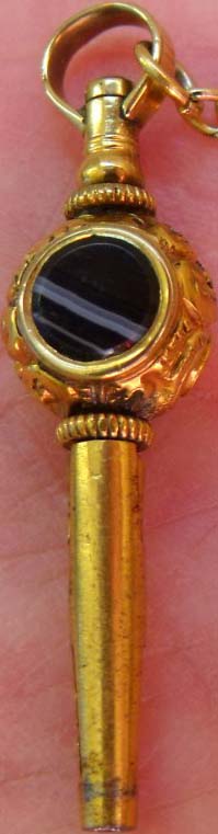 Clé en laiton munie d'une pierre ronde de couleur grise sur une face et noire et blanche sur l'autre face.