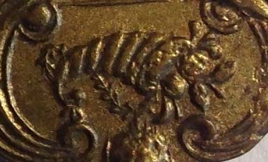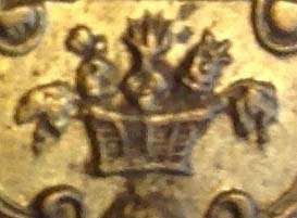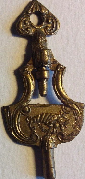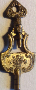 Clé plaquette gravée en forme de cloche représentant un panier rempli de fleurs sur une face et un bouquet de fleurs sur l'autre face..