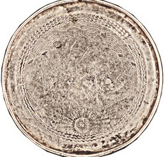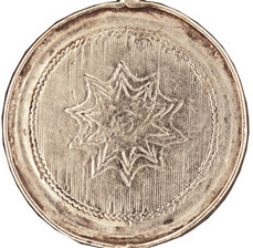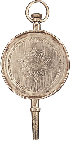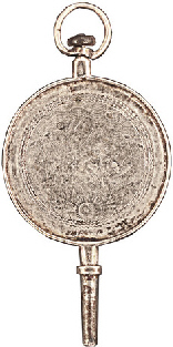 Clé plaquette gravée en argent de forme ovale. Sur une face, un dessin en forme de soleil.