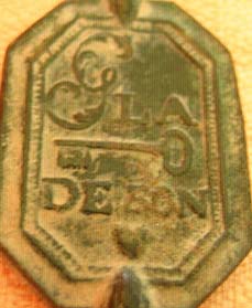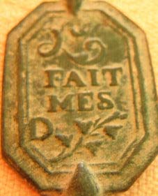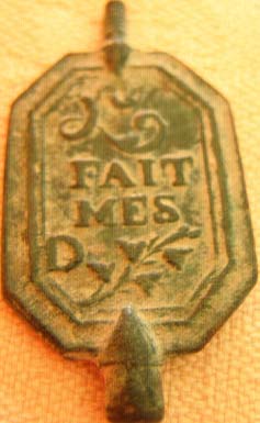Clé plaquette gravée représentant un rébus avec l'inscription " C'est la clef de son coeur" sur une face et "J'ai fait mes d*fleur*" sur l'autre face.
