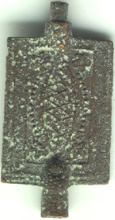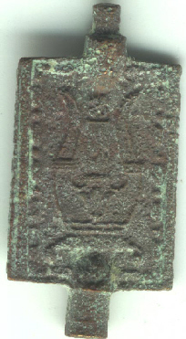 Clé plaquette gravée de forme rectangulaire représentant un urne sur une face et d'un motif floral sur l'autre face.