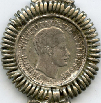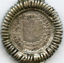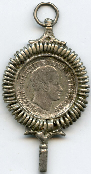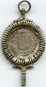 Clé représentant une pièce. Sur une face le portrait d'un personnage. Sur l'autre face, l'emblème d'une "famille royale".